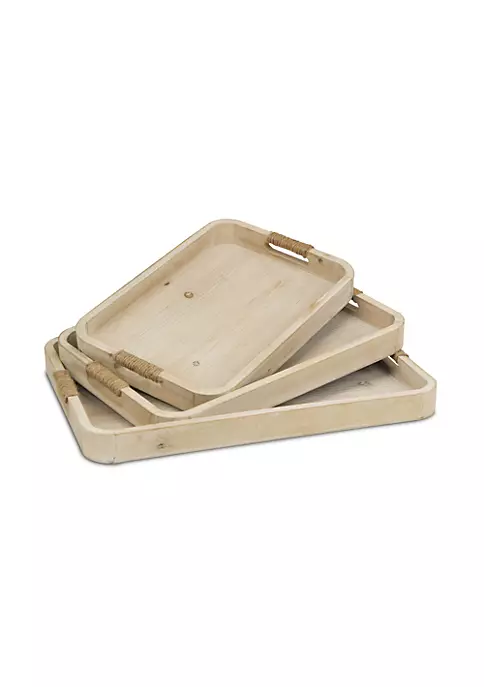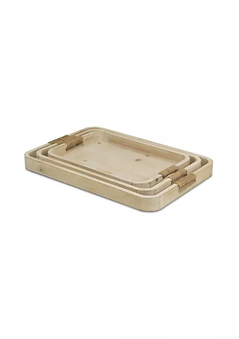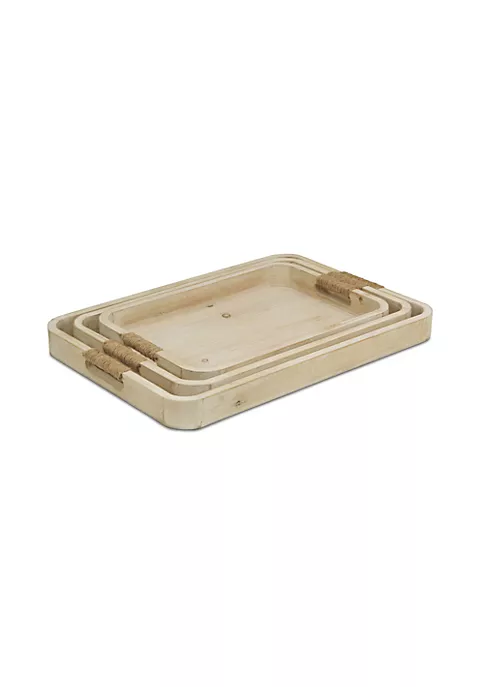 Add a stylish and functional touch to your home with a natural wood tray with rope-wrapped, cut out side handles . A well balanced medium to allow the presentation of decor items or as serving medium for food and drink, this tray allows a wide variety of uses while adding a unique touch. An entirely handmade and hand crafted design. Fully assembled and ready for use, simply unbox and display! This piece is made from a complementary blend of wood and rope materials. Comes as a nested set of 3, large, medium and small Formed in a curved-corner rectangular shape. Includes side cut-out handles with rope wrapped grips Primary Color: White. Product Dimensions: Lg: L: 19.25″ x W: 13.5″ x H: 1.5″ Md: L: 17″ x W: 11.75″ x H: 1.5″ Sm: L: 14.75 x W: 10.25″ x H: 1.5″. Product Weight: 4lbs Assembly Required: No. Primary Material: Wood. Secondary Material: Rope. Country of Origin: China