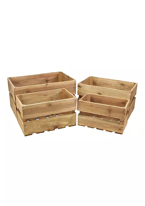 Iconic, natural and homely, crates have eased their way into farmhouse, cottage and natural themed living spaces. This piece inscribed with “Storage” features 4 unique sizes with a slatted construction in a natural brown finish. Accent your living space with a piece that is both functional and decorative. An entirely handmade and hand crafted design. Fully assembled and ready for use, simply unbox and display! This piece is crafted from wood materials. Comes as a nested set of 4, X-large, large, medium and small Each crate comes with cut-out side handles. Inscribed with Storage Primary Color: Brown. Product Dimensions: XL: 20.75″ x W: 13.25″ x H: 11.25″ Lg: L: 18.25″ x W: 11.5″ x H: 10″ Md: L: 16.25″ x W: 9.5″ x H: 9.25″. Product Weight: 13.3lbs Assembly Required: No. Primary Material: Wood. Secondary Material: Metal. Country of Origin: China
