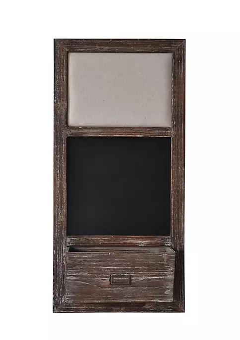 Wood Frame Chalkboard and Pinboard with Storage Slot. Attached Hanging Hooks. Metal Label Decor on Storage Compartment. Linen Pin Board. Assembly Required: No. Distressed: Yes. Wood Frame Chalkboard and Pinboard with Storage Slot. Attached Hanging Hooks. Metal Label Decor on Storage Compartment. Material: Wood, Chalkboard, Linen. Color: Brown. Weight: 3.5 lbs. Assembly Required: No. Distressed: Yes. Dimension: 15″L x 4.5″W x 31″H Country of origin: China.