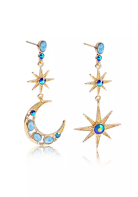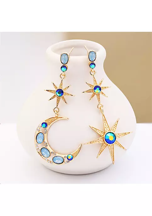 Celestial Moon & Star Drop Earrings Gold Moon Star with crystal and blue tonal colored stone Earrings for Women